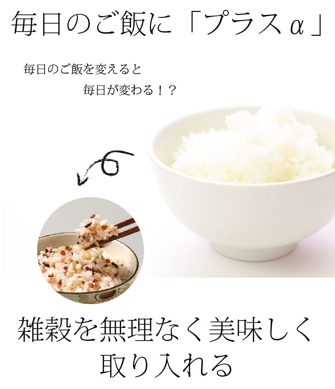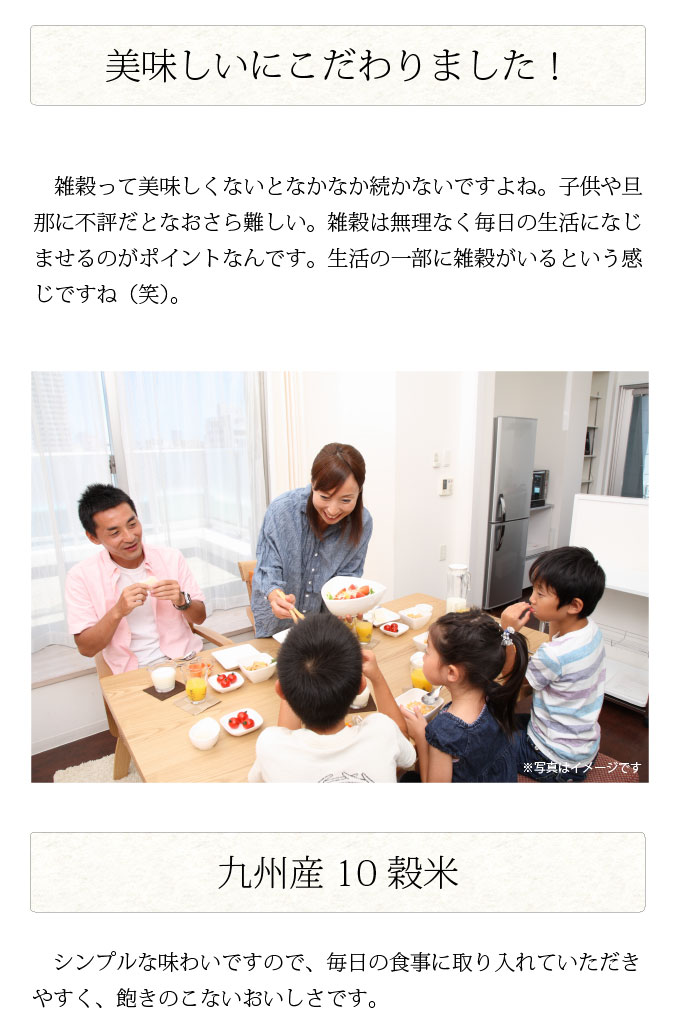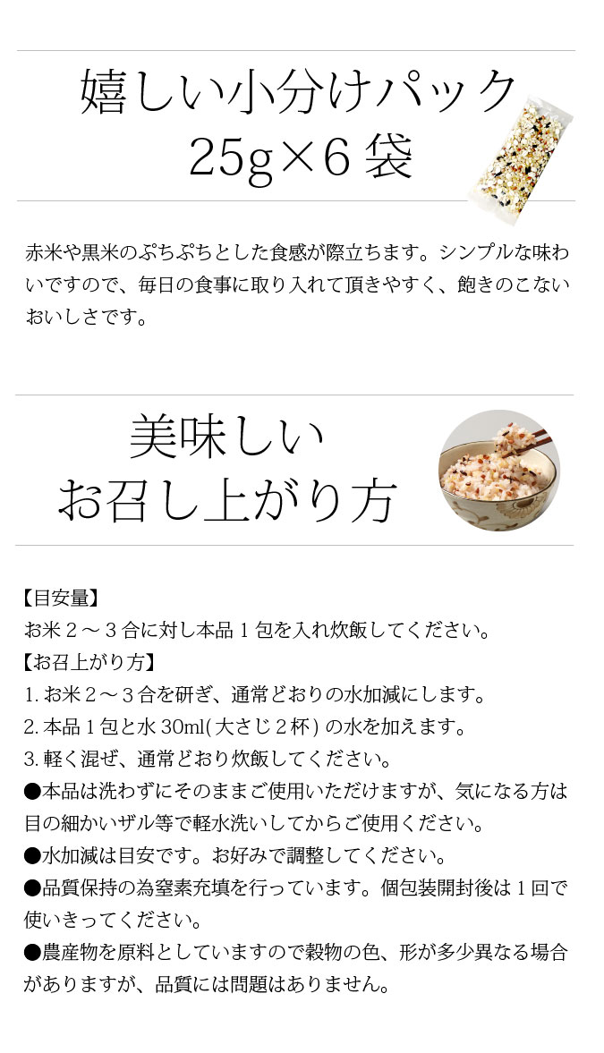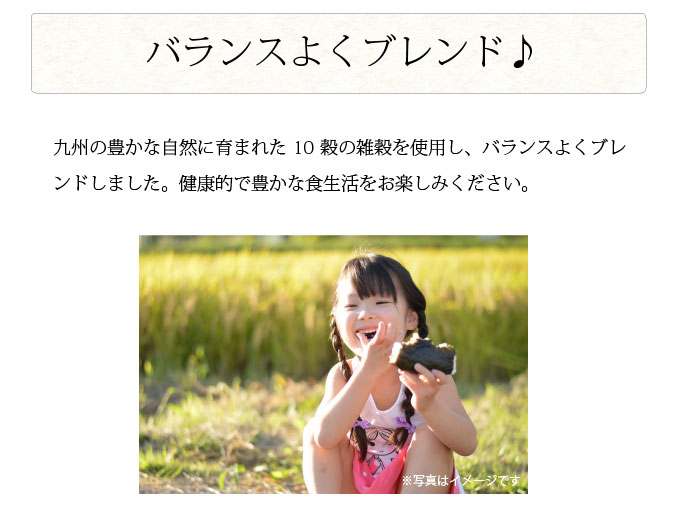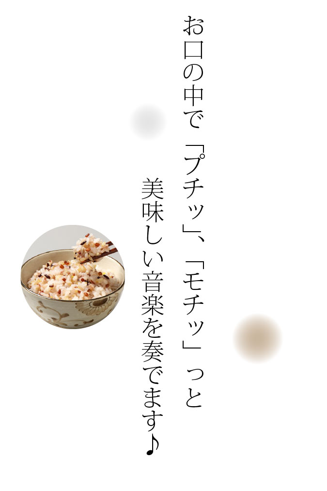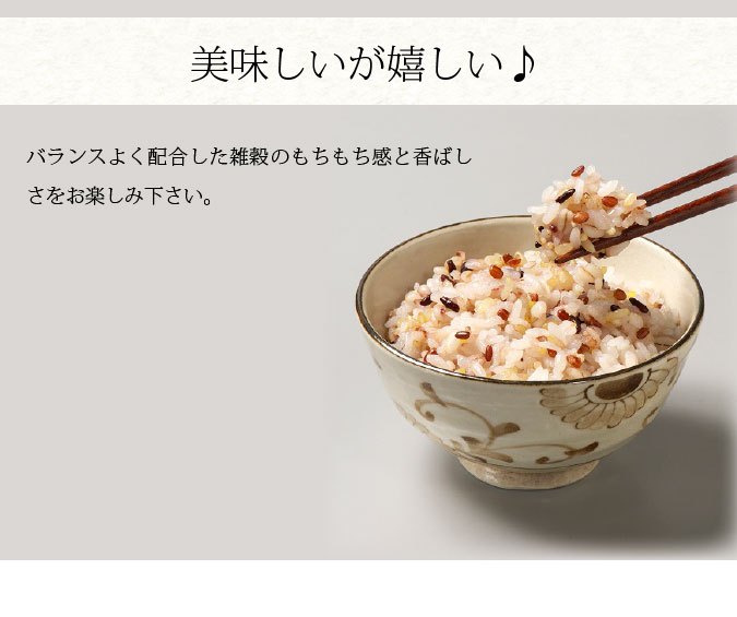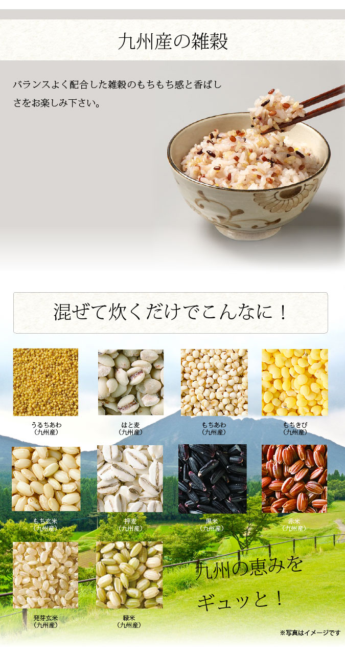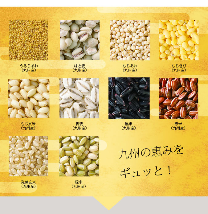 | 原材料名 | 押麦(大麦(九州産))、発芽玄米(九州産)、もち玄米(九州産)、赤米(九州産)、黒米(九州産)、緑米(九州産)、うるちあわ(九州産)、もちあわ(九州産)、もちきび(九州産)、はと麦(九州産) |