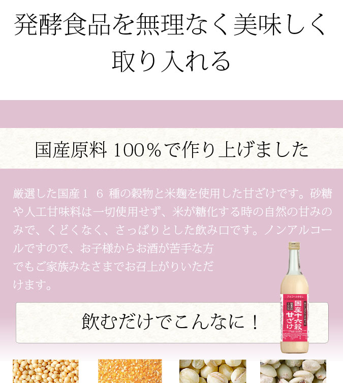 厳選した国産10種の穀物と米麹を使用した甘ざけです。砂糖や人工甘味料は一切使用せず、米が糖化する時の自然の甘みのみで、くどくなく、さっぱりとした飲み口です。ノンアルコールですので、お子様からお酒が苦手な方でもご家族みなさまでお召上がりいただけます。サラッとした中に雑穀のぷちぷちとした食感も残ります。保存料、着色料、食品添加物無添加でつくりました。