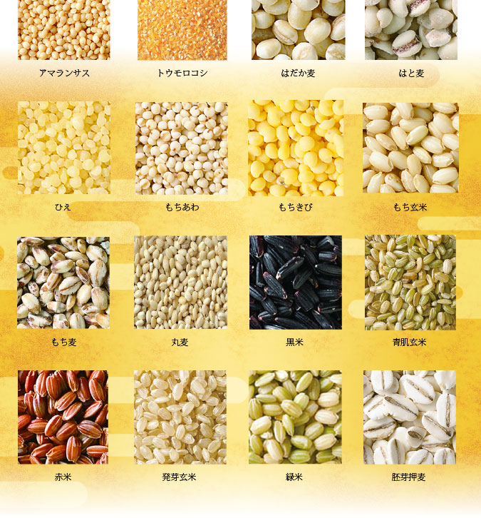 | 原材料名 | 米(国産)、米こうじ、発芽玄米、赤米、黒米、ひえ、胚芽押麦、丸麦、もちあわ、もちきび、もち玄米、アマランサス、とうもろこし(遺伝子組み換えでない)、はと麦、緑米、もち麦、青肌玄米、はだか麦 |