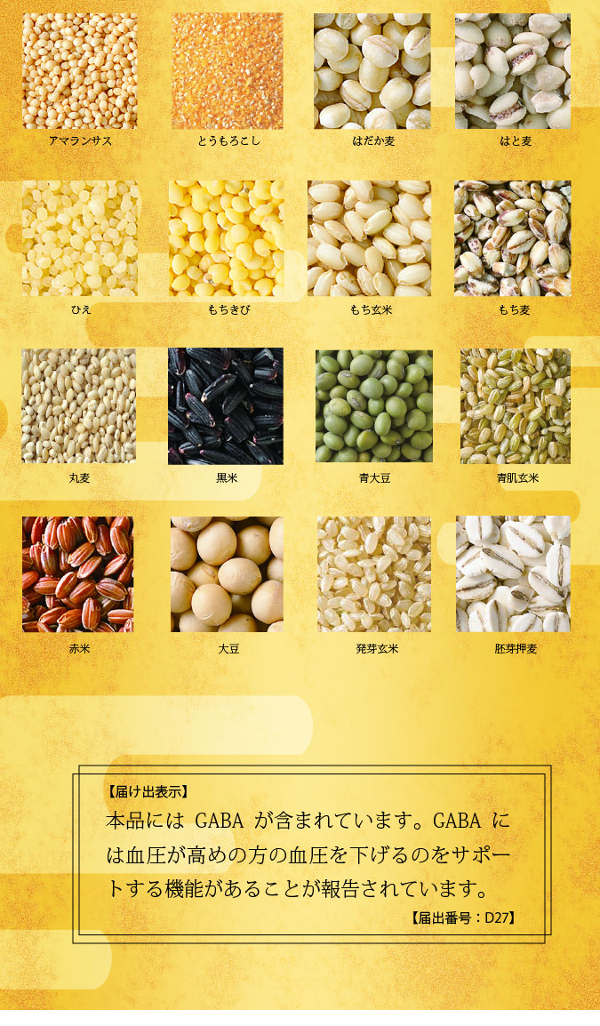 | 原材料名 | 丸麦(大麦(国産))、胚芽押麦、黒米、はだか麦、ひえ、乾燥おから(大豆を含む)、もち玄米、青大豆(遺伝子組み換えでない)、青肌玄米、アマランサス、とうもろこし(遺伝子組み換えでない)、もちきび、赤米、発芽玄米、もち麦、ギャバ、大豆(遺伝子組み換えでない)、はと麦、デキストリン、食用やし油 |