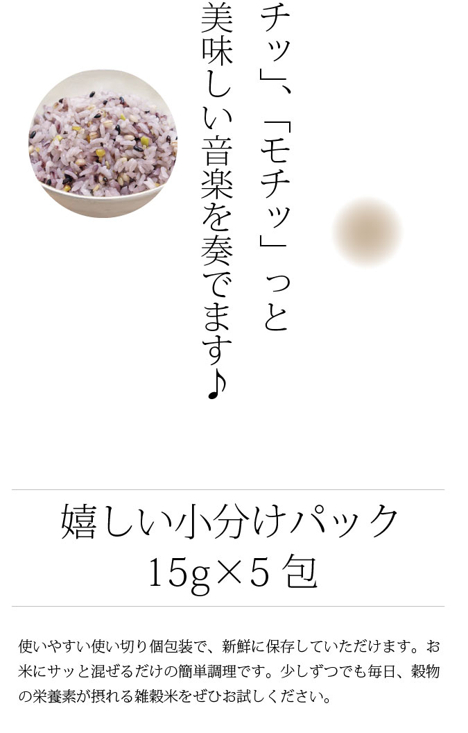 | 摂取の方法 | 本品1袋(15g)と米1合を炊飯し、炊き上がった雑穀ごはん全量(1合分)を目安にお召し上がりください。 |